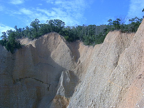 於是卵石一塊塊地由邊坡崩離掉落;平時無雨水時,礫石層又因乾燥硬化