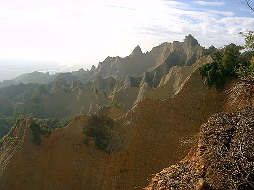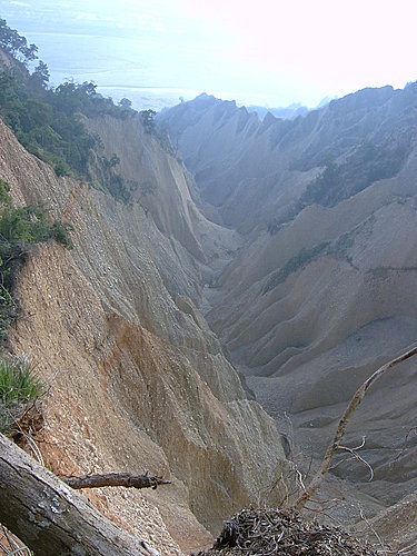 尖銳山鋒、深蝕溝谷組合而成,谷中堆滿了暴雨沖刷崩落下來的卵石,