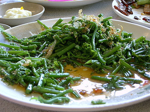 被我們放在一起的菜色(左邊是"鳳梨蝦球",右邊則是有名又好吃的"酥炸南瓜".)