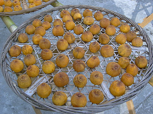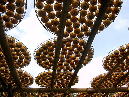 柿餅的製作流程如下:柿子採收後用特殊刨刀將外皮除去,刨的深度須一致,然後將柿蒂朝下整齊地排列在圓形竹篩上,曝曬3?4天即開始變軟且糖份增加,色澤也從橙黃色轉變為棕褐色,這時須經數道人工捻壓成扁平狀,並持續進行日曬並接受九降風的風乾。