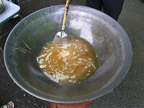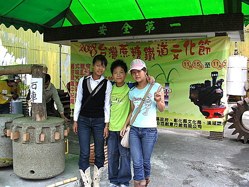 傳統榨甘蔗汁的石車,早年石車是以牛車來拉動,為了讓民眾體驗推石車的辛苦,昨日也特地在石車加上木杵,現場還有鍋爐熬煮甘蔗汁,經4個小時熬煮後,糖漿變成結晶體,此即「蔗糖」的傳統作法。