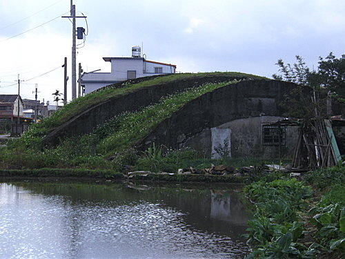 機堡以鋼筋水泥砌成,弧形的屋頂,覆土植草以做偽裝,停放俗稱「紅蜻蜓」的日軍戰鬥機。