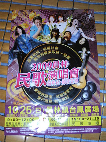 晚上員林鎮鎮公所舉辦民歌演唱會,有殷正洋,葉璦菱,王夢麟,許景淳,南方二重唱,潘越雲......等藝人。