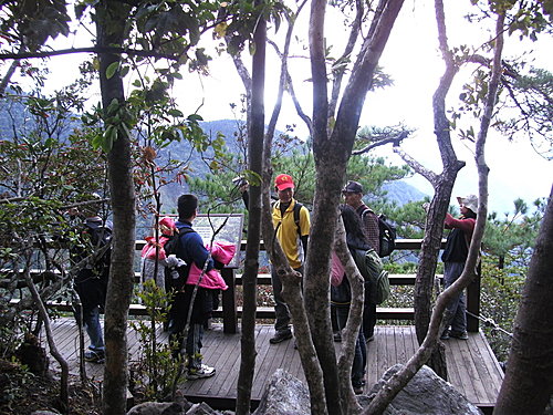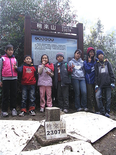 | 稍來山和鳶嘴山隔鞍相對,其寬稜緩坡樹蔭蔽日,標高2301公尺, 有一個二等三角點,也有一座森林瞭望台, 在瞭望台上可眺望玉山、秀姑巒山、郡大山、東西巒大山、白狗大山、中央尖山、大劍山、佳陽山等百岳名山,不過今日霧氣過重,無法親眼目睹。 |