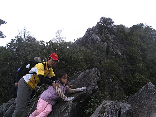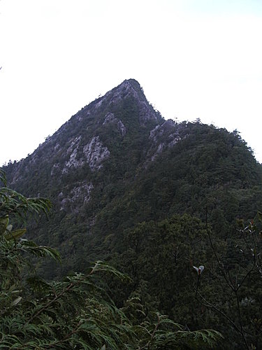 | 看到今日目標--鳶嘴山到了~注意看!樹葉隙縫中有沒有發現有人穿著紅衣正在裸岩中攀爬著。 |