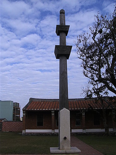 前埕前有一座旗杆座,為清咸豐9年(1859)陳培松中式舉人所設置。--益源古厝的主人陳氏家族的開台祖先陳武,因在福建謀生不易而於一七九二年渡海來到彰化,先是替人幫傭,後來則經營檳榔、藥材、米糧等生意得法,而累積下龐大的財產,除了在彰化購置了大批的田產之外,甚至遠至大甲、梧棲等地,也都有他的產業。由於他以經營檳榔起家而致富,時人稱他為「青仔武」。陳武有四個兒子,在事業發達之後,陳武送長子和三子到北京入學,想要經由科舉謀取功名,但均無所成。直到一八五八年,第三代的陳聯茂才得中舉人,得以在門前豎立旗竿。