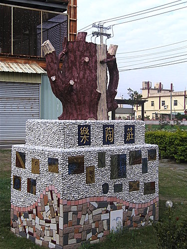 這個就是"樂陶莊"。來自彰化秀水馬興的陶藝家吳鑫山,世代務農,但後來為了家計,投入鉚釘製造事業(也是俗稱的「黑手」)。1994年,當時馬興國小校長楊秋雄,推動多項藝術研習活動,吳鑫山便一頭栽進陶藝世界裡,並在2005年成立「樂陶莊」展覽館。