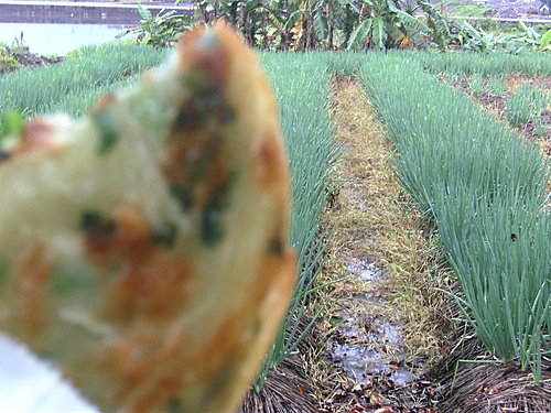 手上的蔥油餅就是後方的宜蘭青蔥啦!