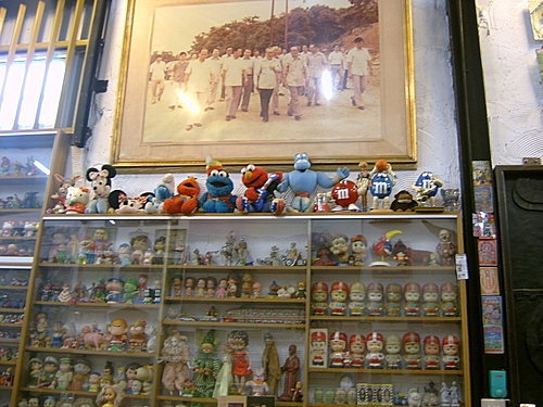 黃源椿(坐著那位)是銅鑼鄉長黃芳椿的哥哥,早期經營雜貨店,見廠商贈送的各種廣告印製精美,興起蒐藏的念頭,但蒐藏想法一動,蒐集的範圍越來越廣,舉凡家具、擺飾、月曆、廣告、報紙等,和印著「包娘喜歡」的牙粉包裝、永樂戲院公演的海報、法金寺印籤詩的版模、公賣局不同年分的酒瓶及房地契、鍋碗瓢盆等,幾乎以包羅萬象方式,全部收納。