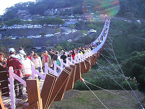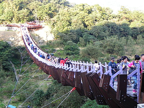 這座被漆上淡紫色彩並揉和兩側木頭暗褐色的吊橋,位於碧山巖到白石湖農村聚落之間,橫跨忠勇山與大崙頭山系。 龍骨吊橋上擠滿長長的人龍.便可了解它的受歡迎程度.
