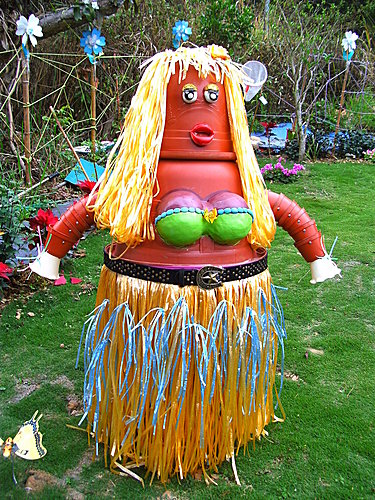 可愛吧!利用各種不同大小的花盆拼湊出造型奇特的娃娃深受感動.嘴上含著奶嘴,手上卻持著槍枝,是否讓人很會心一笑呢?