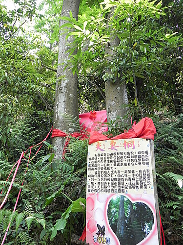 據說有情人或夫妻一起至此,在夫妻桐的守護見證之下,兩人先一手相互緊握,另一手各自輕握圈綁於夫妻桐上紅線的一端,共同許下愛的願望,往往能夠心想事成,尤其每年四月油桐花盛開如雨落,遍地雪白的時節更是靈驗……。