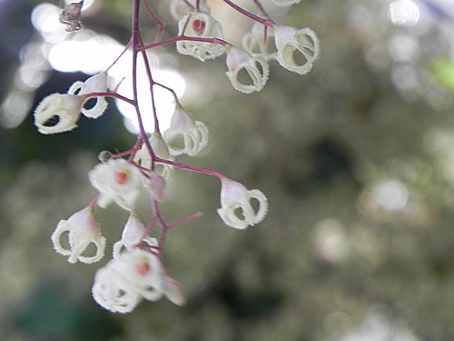 圓錐花序腋生或頂生,柔弱下垂,披散,萼鐘形,乳白色至淡紅色,5 裂,裂片淺狀披針形,先端漸尖並向內曲在頂端處粘合,花於 3 月下旬至 5 月開放。