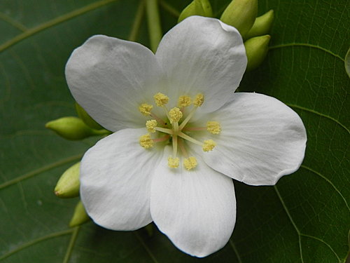 賴在姑婆芋上的油桐花,似個嬌羞小姑娘!