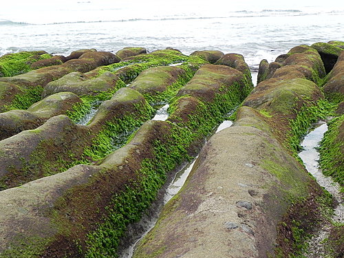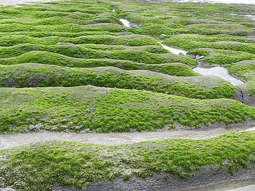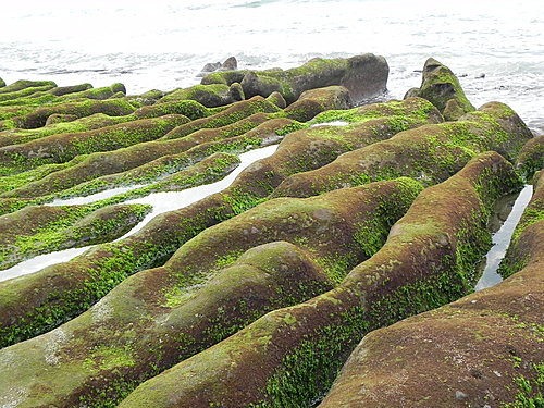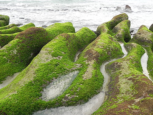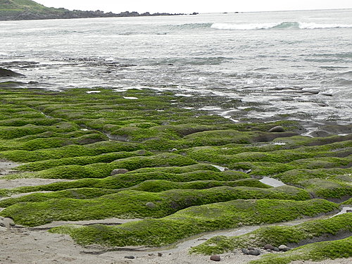 因為岩石間本就明顯的侵蝕溝,把原本連成一片的綠藻,分置在高高低低的岩石間,自在生長的綠藻礁,就隨著岩石與深溝生長,變化出翠綠美麗的圖案。