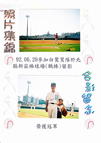 下圖:92.06.29參加白鷺鷥球隊於新莊職業棒球場比賽榮獲冠軍。