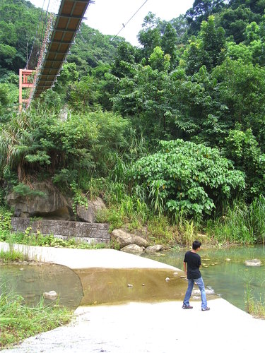 猴洞坑自然資源保育區裡的這座吊橋,橋長約50公尺,獨特之處在於吊索設計與一般的吊橋相反,為下懸式;走在穩固無比的橋上,除了可眺賞山豁溪景,幸運的話,還可瞧見野生獼猴。