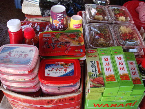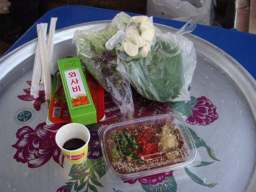 從停車場往漁港路上,我們看到了不同文化:韓國的「化緣扥缽」。
