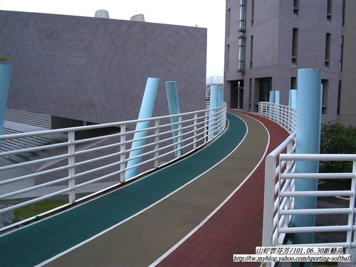 | 沒有操場, 但有一條百米直線跑道和一條穿起全校建築的空中跑道。 |