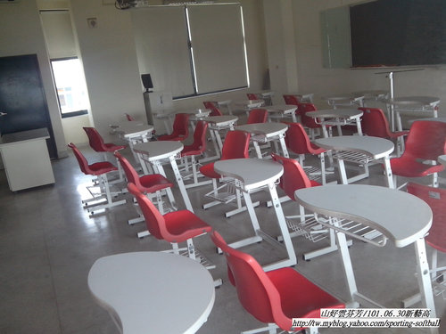 | 連課桌椅都是破表高級喔!太極型的桌椅兩張合起來就是一個圓。(應該很貴!) |