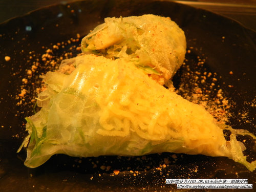 擺盤還用糖粉灑了原燒的字,很特別吧!冰淇淋上面灑了花生粉,旁邊那一條條則是麵條。