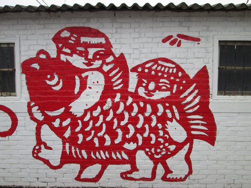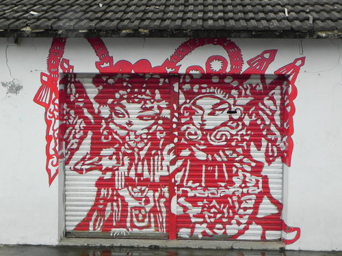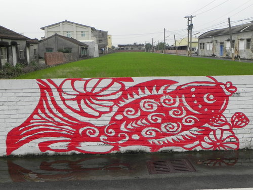 以傳統剪紙做為社區意象,120戶長達500公尺的牆面,經過彩繪後,煥然一新。